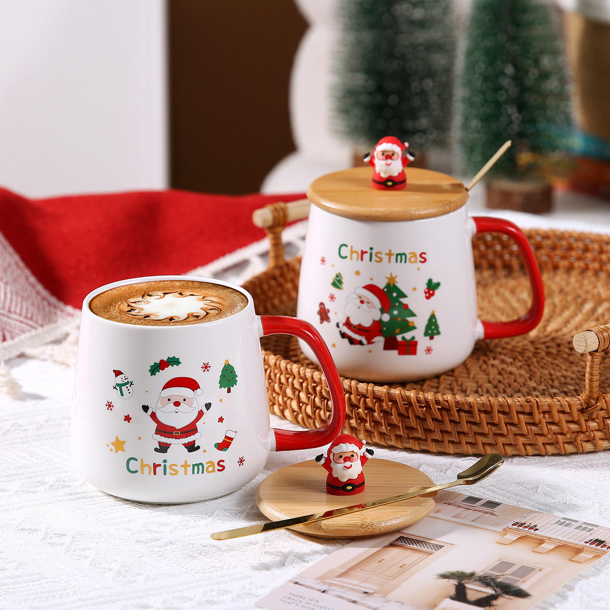 Cute Santa Claus and Christmas Tree Design Ceramic Mug with Lid and Spoon