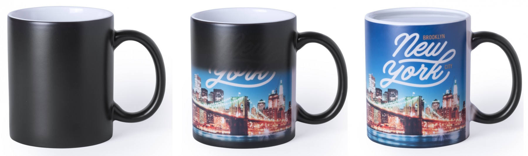 11 oz heat-sensitive ceramic mug with color-changing effect, perfect for custom logo printing and promotional use.
