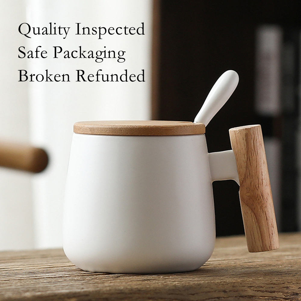 Nordic-style 14oz matte ceramic mug with wooden handle, lid, and spoon. Perfect for customized gifts and café branding.